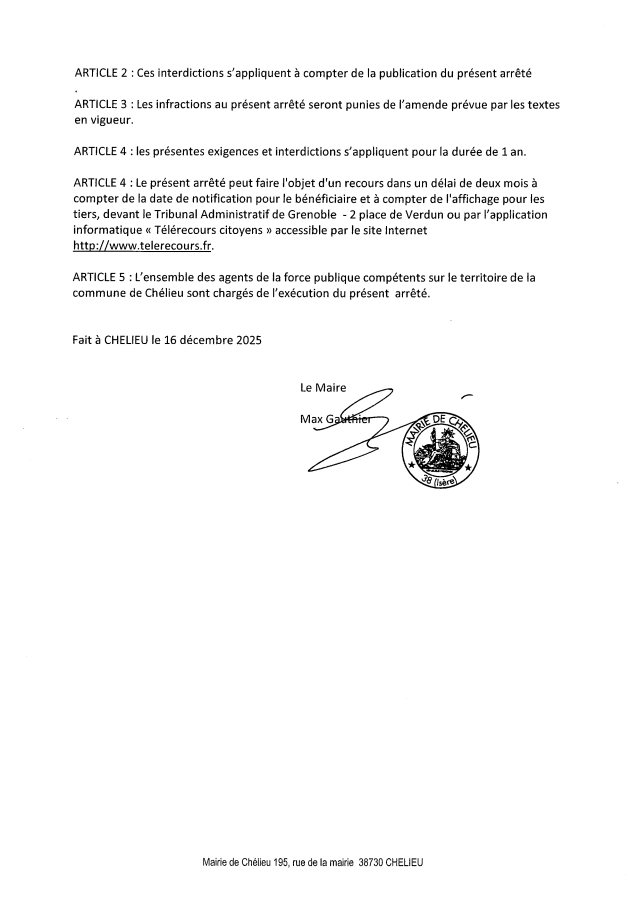 Afin que les Forces de l’Ordre puissent intervenir en toute légalité, M. le Maire a pris un arrêté en conséquence, dont une copie est présente ci -dessous.