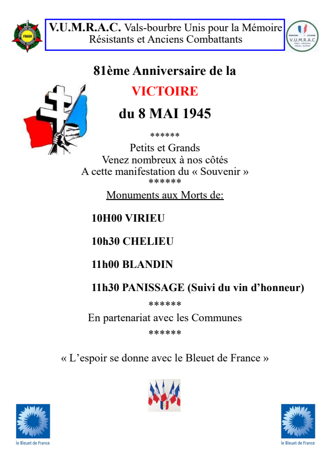La cérémonie célébrant l’armistice se déroulera devant le Monument aux Morts situé au sein du cimetière de Chélieu le vendredi 8 mai prochain à 10h30.