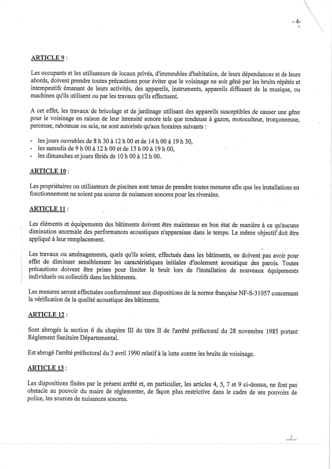 Par arrêté préfectoral, les bruits de voisinage issus de matériels de jardinage ou de bricolage sont autorisés :